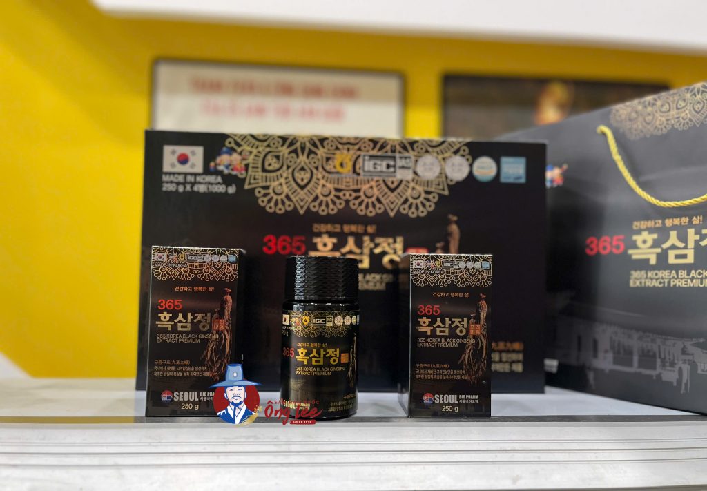 Cao Hắc Sâm 365 Seoul Bio Pharm Hàn Quốc 4 Lọ x 250g là sản phẩm thượng hạng được chế biến từ nhân sâm. Từ bạch sâm ( hay còn gọi là sâm tươi 6 năm tuổi) để trở thành hắc hồng sâm phải trải qua 9 công đoạn chưng và sấy khô ở nhiệt độ thấp để tạo ra hắc hồng sâm (được gọi với cái tên thuần việt là nhân sâm đen). Sau đó tiếp tục được chiết xuất và cô đặc thành cao hắc hồng sâm. Nhờ vàng bảng thành phần sau thời gian dài đã nói lên giá trị của cao hắc sâm. Sản phẩm tiêu biểu của SamSung Pharm được tin dùng và lưu hành trên khắp thế giới.