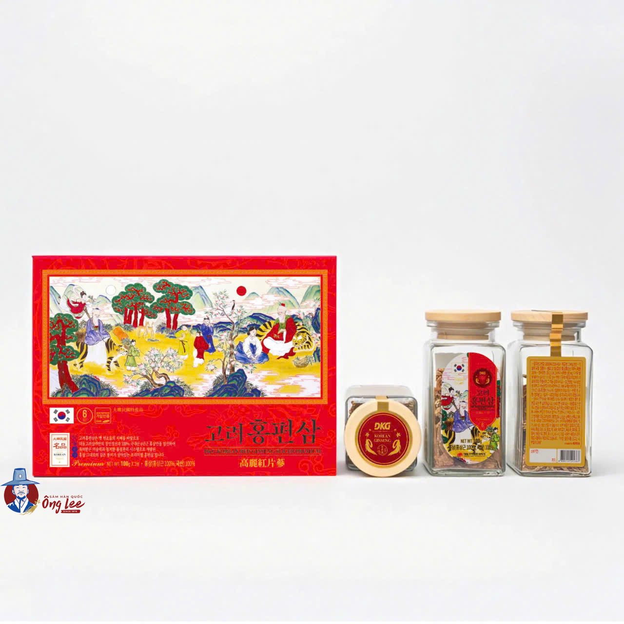 Hồng sâm khô Hàn Quốc thái lát premium Daedong hộp 3 lọ x 100g tiện dụng, giàu saponin, giúp tăng đề kháng, bồi bổ sức khỏe, giảm mệt mỏi, thích hợp làm quà biếu sang trọng.