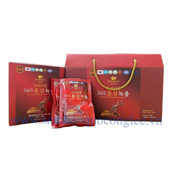* Nước Chiết Xuất Hồng Sâm Nhung Hươu Linh Chi 365 Hàn Quốc Hộp 20 Gói x 70ml là sản phẩm của sự kết hợp giữa các loại thảo dược quý hiếm của xứ sở Kim Chi. Sản phẩm giúp phục hồi, bồi bổ sức khỏe, phòng ngừa các bệnh mãn tính, bệnh người già.