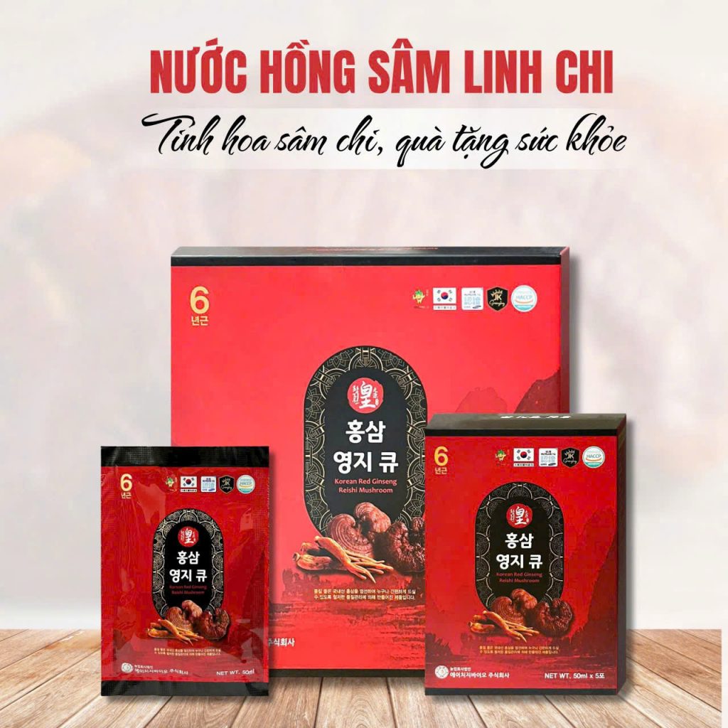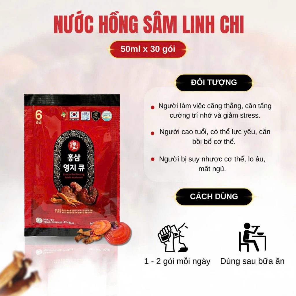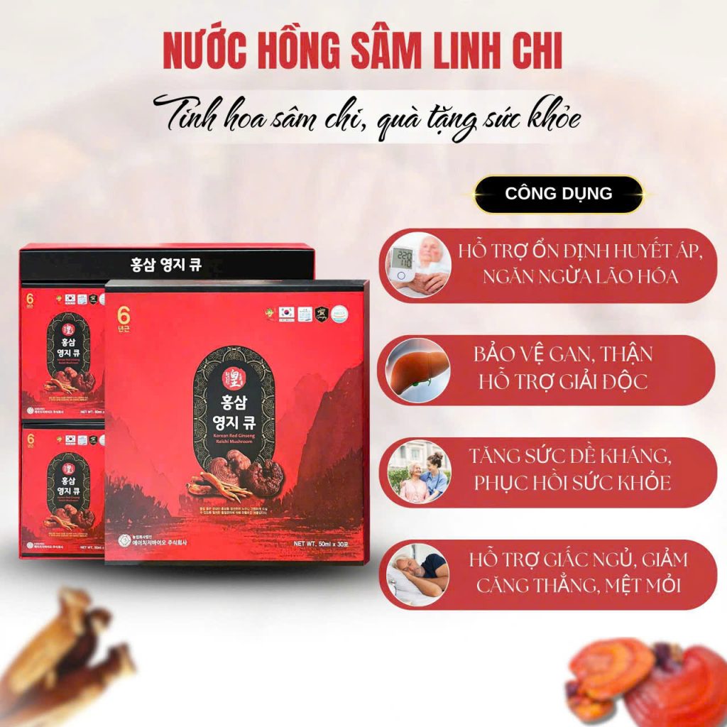 – Nước Hồng Sâm Linh Chi Hàn Quốc là sự kết hợp tinh túy giữa hồng sâm 6 năm tuổi và nấm linh chi giúp bồi bổ cơ thể, tăng cường hệ miễn dịch và cải thiện giấc ngủ hiệu quả.