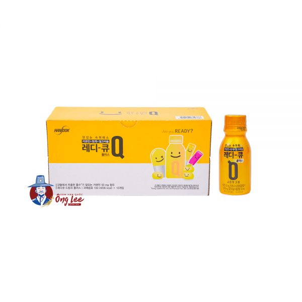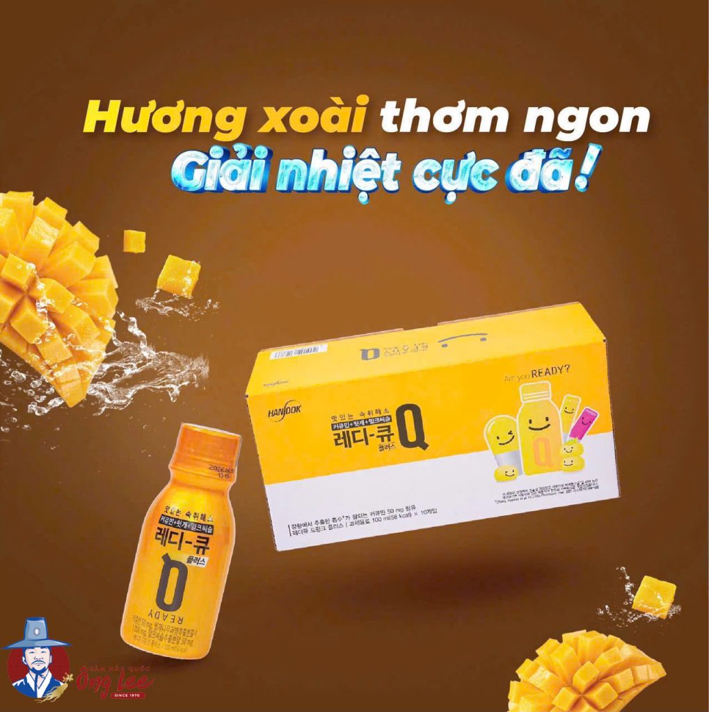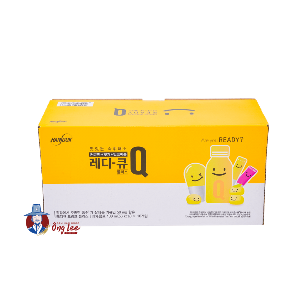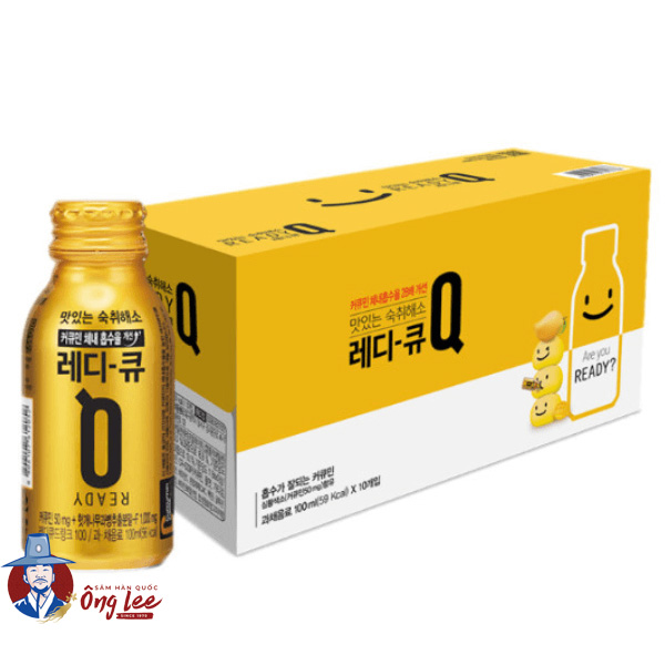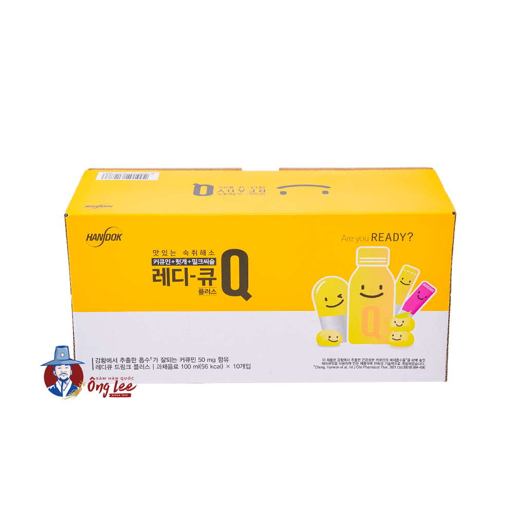 * Nước giải rượu Ready Q là một phương pháp giải rượu khoa học từ Hàn Quốc. Sự kết hợp của chiết xuất nghệ (curcumin), chiết xuất cây nho phương Đông và chiết xuất cây kế sữa giúp cho việc giải quyết cơn say trở nên an toàn và hiệu quả. Đồng thời, sản phẩm còn có tác dụng bảo vệ niệm mạc dạ dày và cải thiện sức khỏe đường ruột.