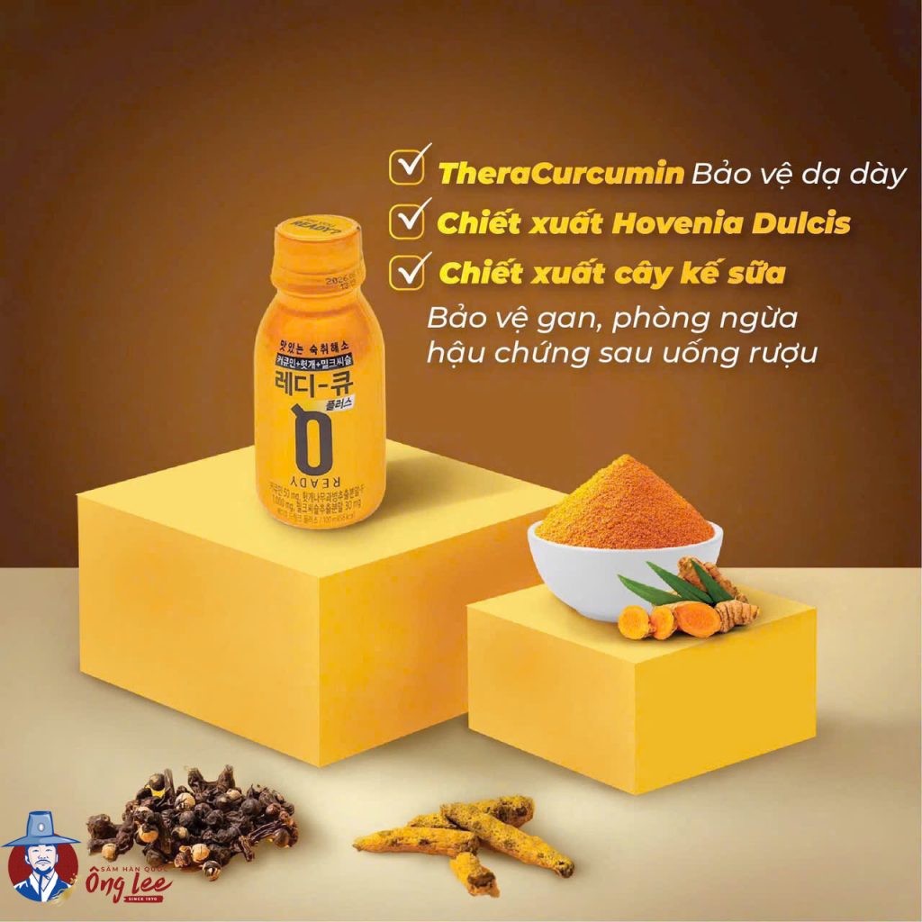 Nước giải rượu Ready Q là một phương pháp giải rượu khoa học từ Hàn Quốc. Sự kết hợp của chiết xuất nghệ (curcumin), chiết xuất cây nho phương Đông và chiết xuất cây kế sữa giúp cho việc giải quyết cơn say trở nên an toàn và hiệu quả. Đồng thời, sản phẩm còn có tác dụng bảo vệ niệm mạc dạ dày và cải thiện sức khỏe đường ruột.